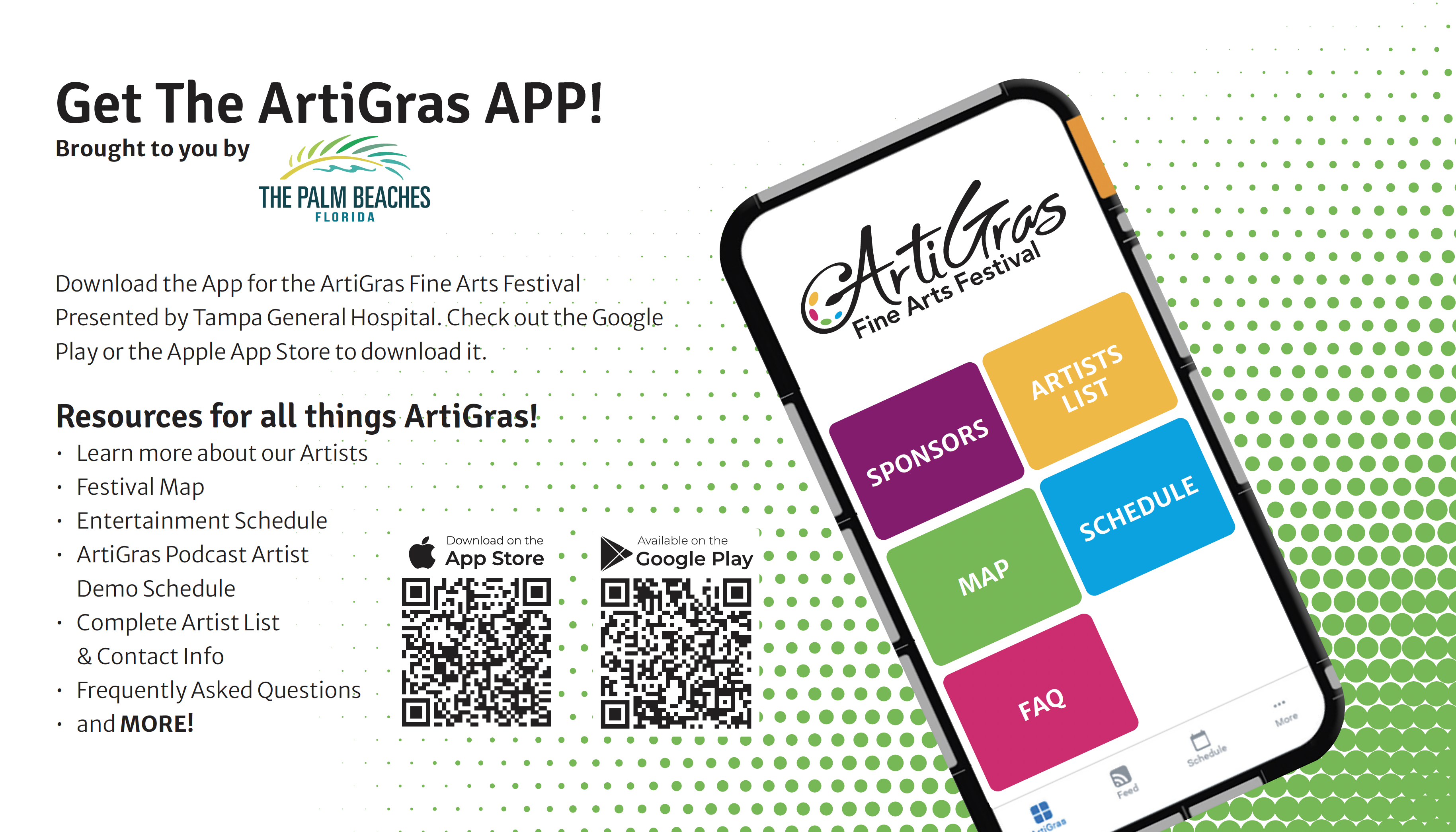ArtiGras Fine Arts Festival, Presented by Tampa General Hospital, is an outdoor arts event showcasing a juried exhibition of outstanding fine art and featuring activities which include live entertainment, artist demonstrations, interactive art activities for all ages and a youth art competition.